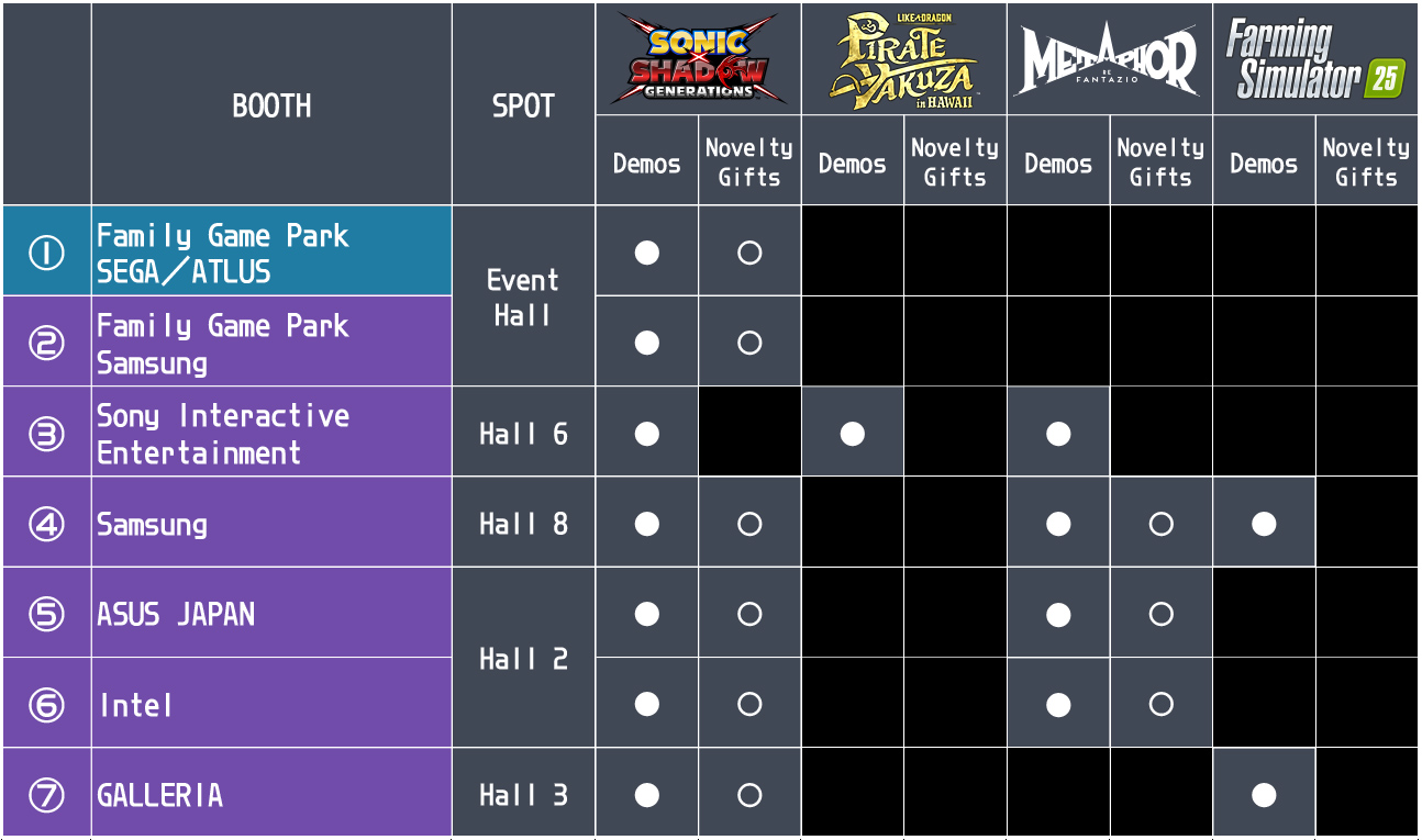 *For details on the demos and free gifts available at the SEGA/ATLUS Booth (Hall 4), see the Lineup page.
